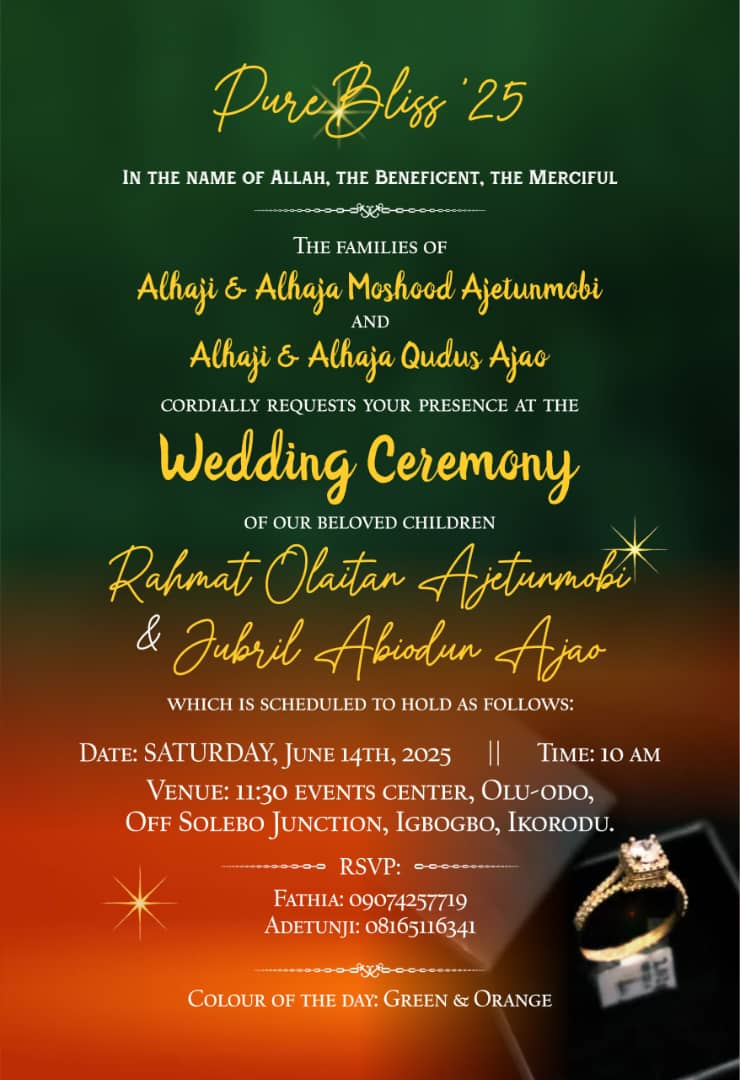 Once upon a time, two people swiped right (or maybe just locked eyes across the room—we’ll let you guess 😉). Our story has been filled with laughter, late-night suya, inside jokes that make no sense to anyone else, and now, one really fabulous wedding day. And honestly? It wouldn’t have been the same without you.